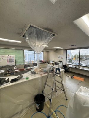 周囲の床・壁・設備に水がかからないよう、しっかりと養生します。