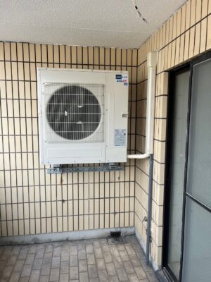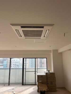 先日、神戸市中央区にあるビルのテナント区画にて、天井カセット形パッケージエアコンの更新工事を行いました。