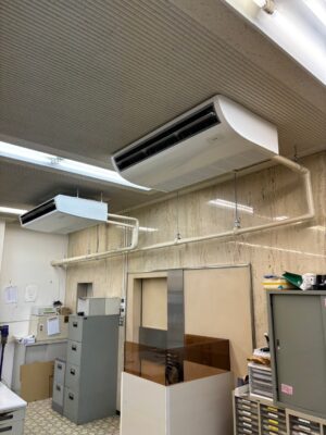 天吊りパッケージエアコンを2台新規で設置した事例をご紹介します。